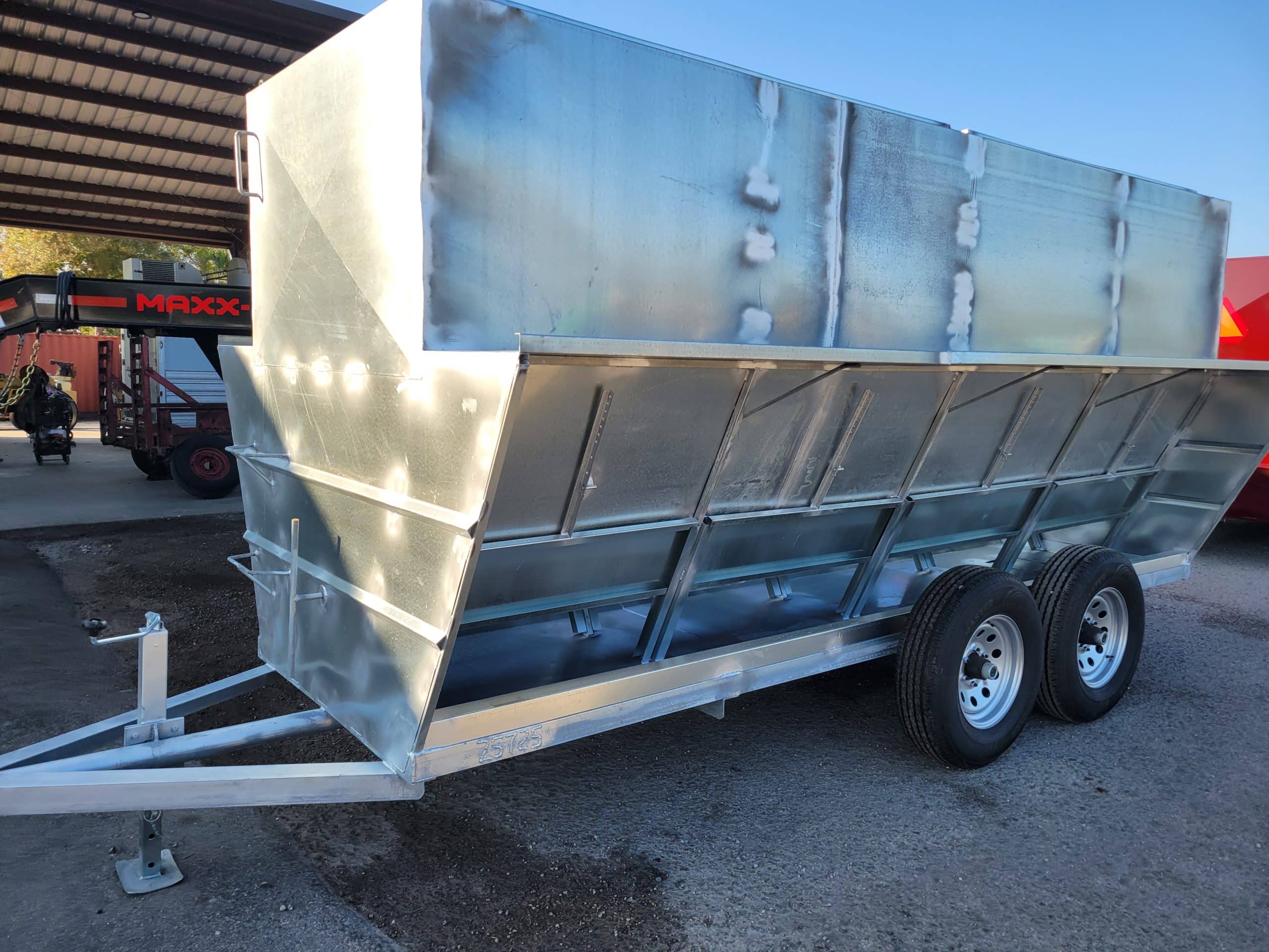 Hooten Creep Feeder 2026 4-Ton. 2-5200lb Reinforced Axles, ST225/75R16 Tries on 16″ wheels. The Trought is 14Gauge Galvanized Sheet Metal, Top and Sides are 16 Gauge Galvanized Sheet Metal. The Tongue is 2-7/8″ Pipe x .190 Wall Thickness and Reinforced with 2-3/8 Pipe, 7/8 Hitch pin hook up Front and Back. 2 Top doors for loading that lock into place. 8- Adjustable side doors (4 per side). Frame is 3″x 3″ x 3/16 Angle. 8000lb Drop Leg Jack. Clean out Tray in bottom of Trought.