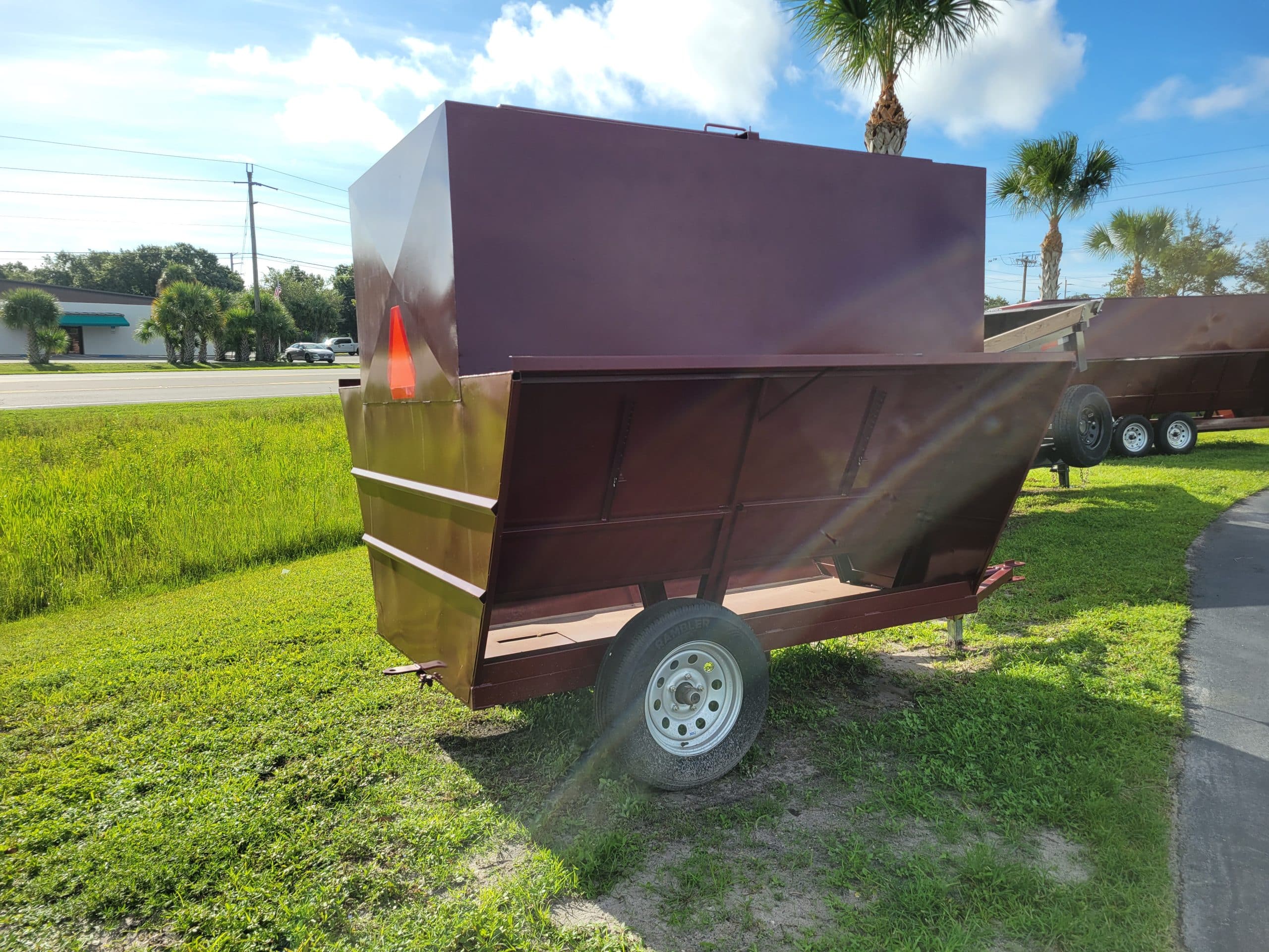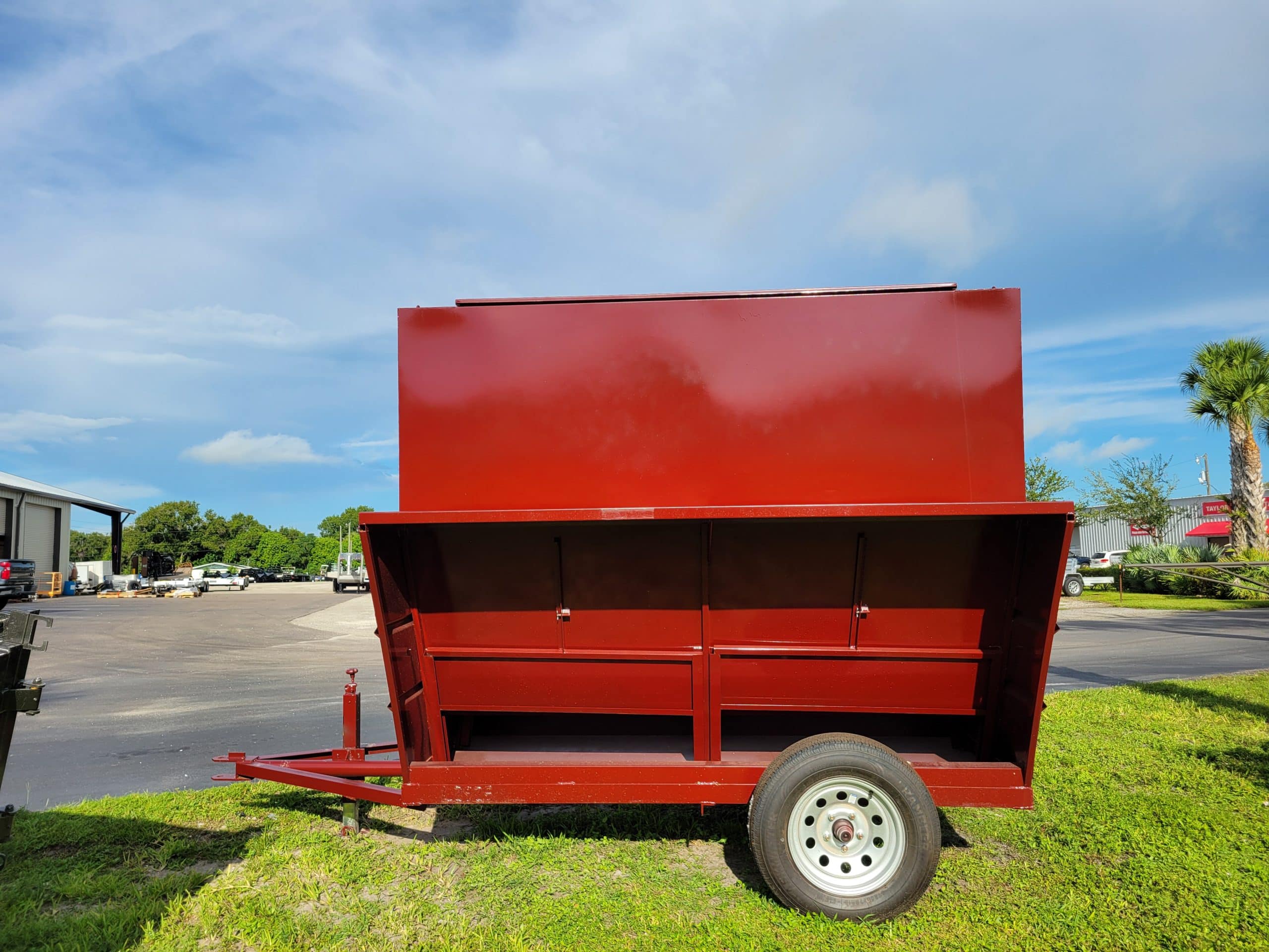 Hooten 2026 2-Ton Creep Feeder. 1-3500lb Reinforced Axle with 5 on 5 Bolt Pattern Wheels and Tires. Trought is 11 Gauge, Top and Sides are 16 gauge. Tongue is made of 2-7/8 x .190 wall Pipe Reinforced with 2-3/8 pipe with a 7/8 Hitch pin hook up Front and Back. 1-Door Up Top for loading, 4-Adjustable Feeder Doors (2 per side). Undercarriage is 3″ x 3″ x 3/16 Angle, 7000lb Drop Leg Jack.