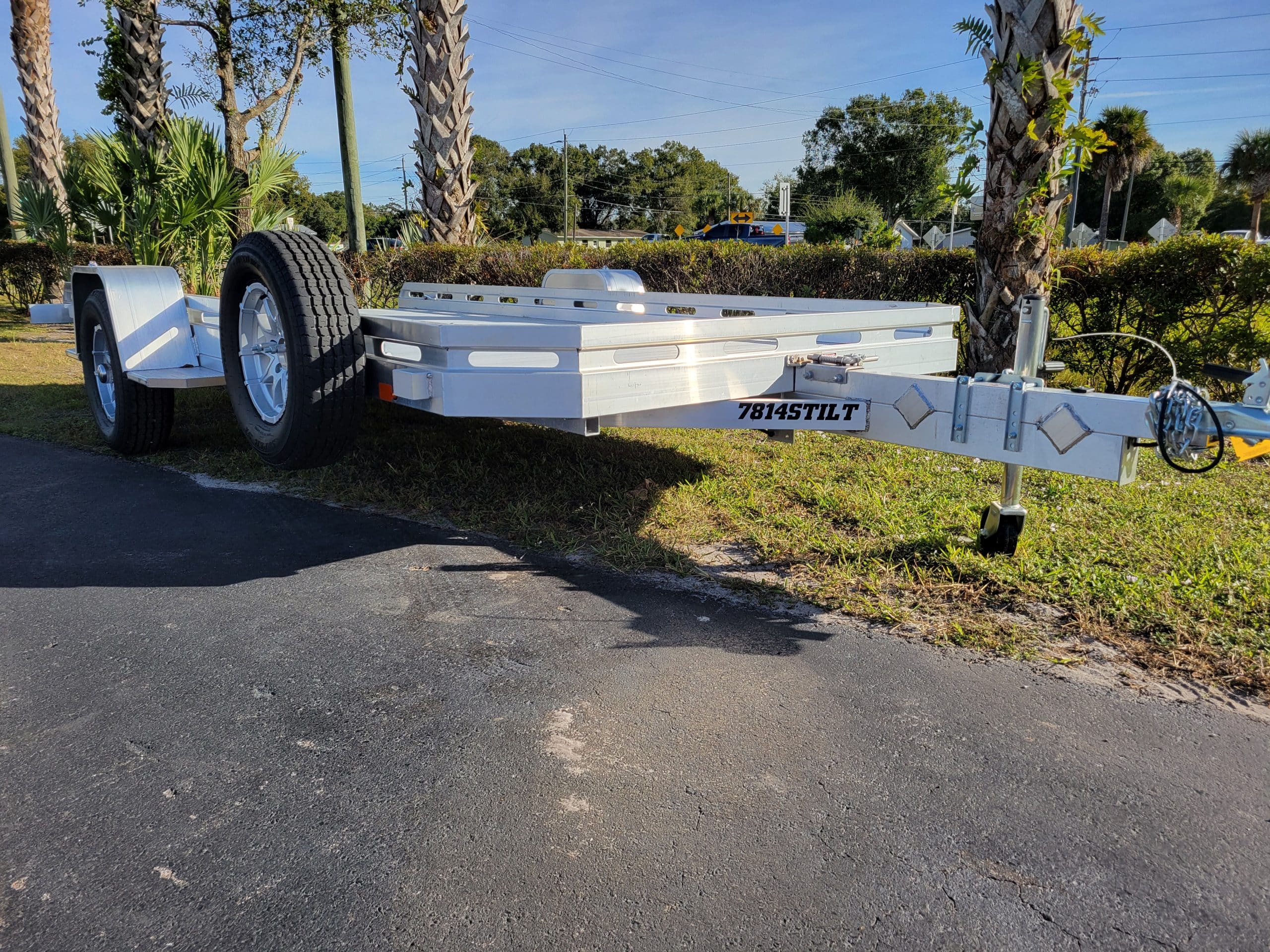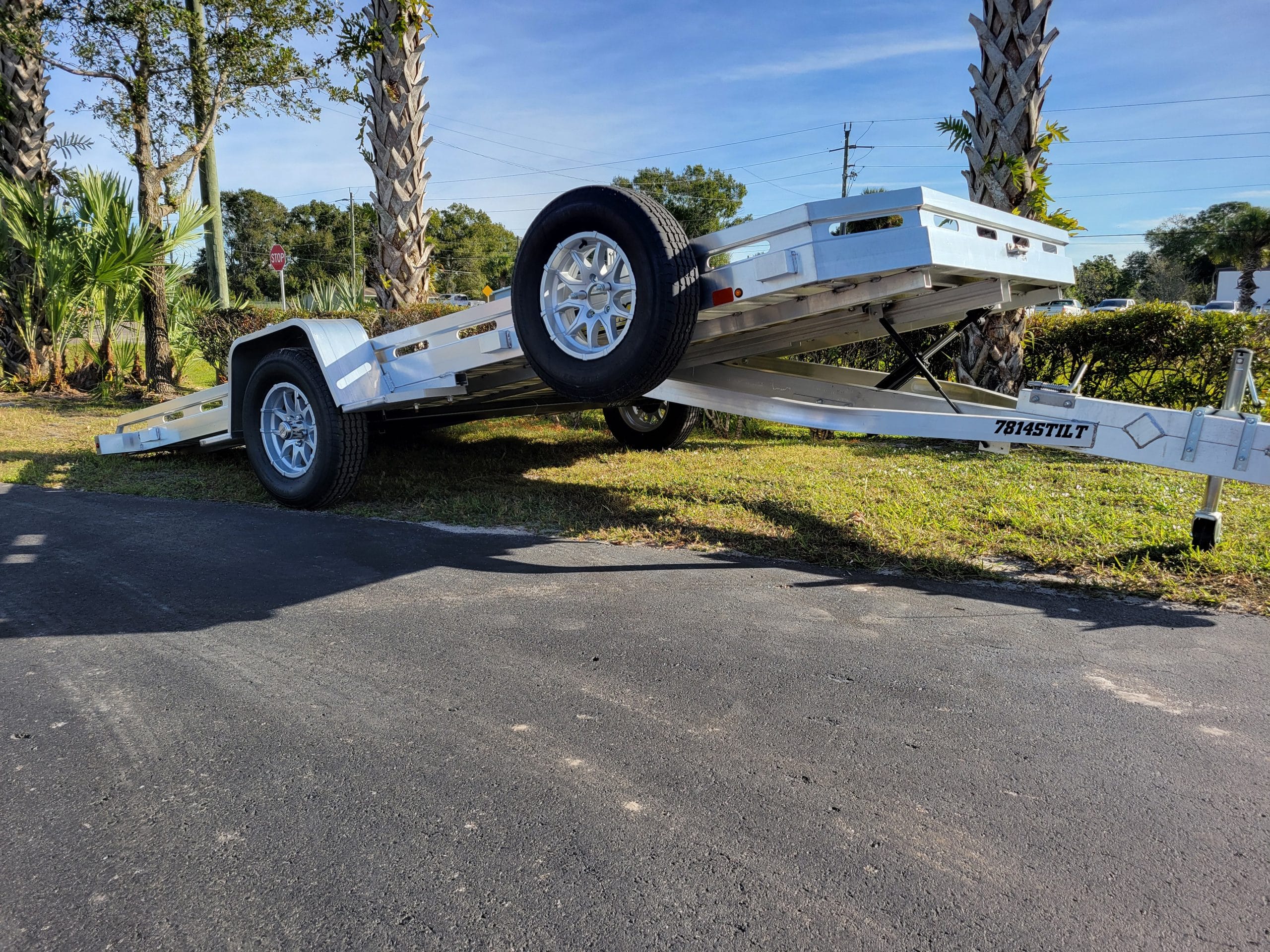 ALUMA 7814 TILT 2026. 1-Rubber torsion 3500lbs axle, ST205/75R14 tires on 14″ Aluminum wheels with spare and mount. Hydraulic dampener with gas lift. Aluminum fenders, Extruded aluminum floor. 8.5 Front & Side retaining rails, A-Framed aluminum tongue, 48″ long with 2″ ball coupler. 6- Stake Pockets (3 per side), 4-Tie down loops (2 per side). Tongue handle, receptacle holder, fender steps. Swivel tongue jack 1200lbs capacity. LED lighting package, 7way RV plug with sealed harness.
