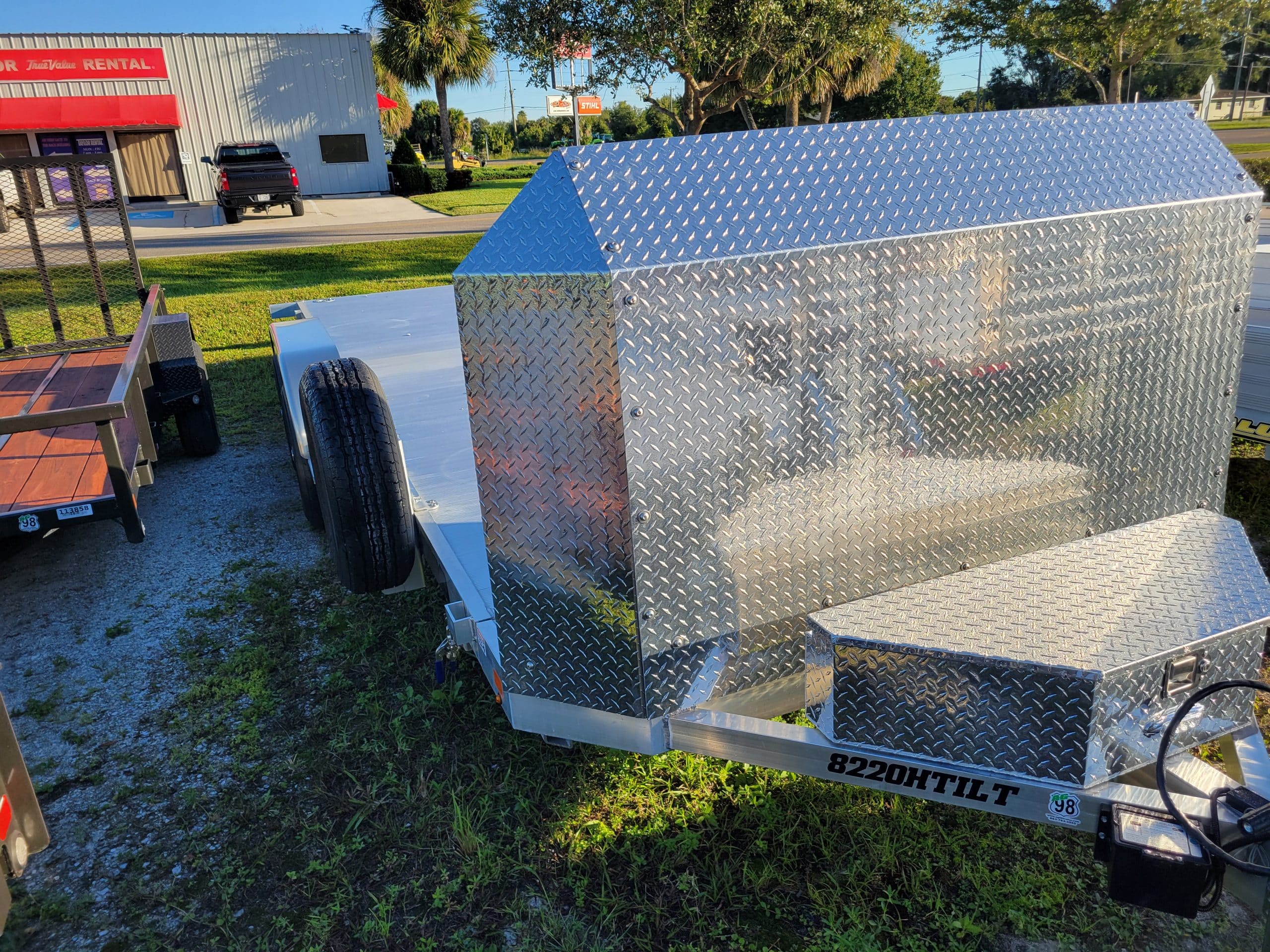 ALUMA 8220H TILT A 2026. 2-5200lbs Electric Brake Torsion Axles. ST225/75R15 Tires On 15″ Black Aluminum Wheels w/Spare and Mount. 40″ Spread Axel w/Removable Fenders. Front retaining rail, Extruded aluminum floor. A-framed aluminum tongue, 44.5″ long with 2 5/16 ball coupler. 4) Recessed tie rings SS#5500, 8) Stake pockets (4 per side). Fender steps, tongue handle, Receptacle holder. Padded tongue jack 2500lb capacity. LED lighting package, 7way RV Plug w/Sealed harness. Bed Lock for travel and for locking bed in up position. Tongue toolbox, Air Dam, and 8-Bed Lights.