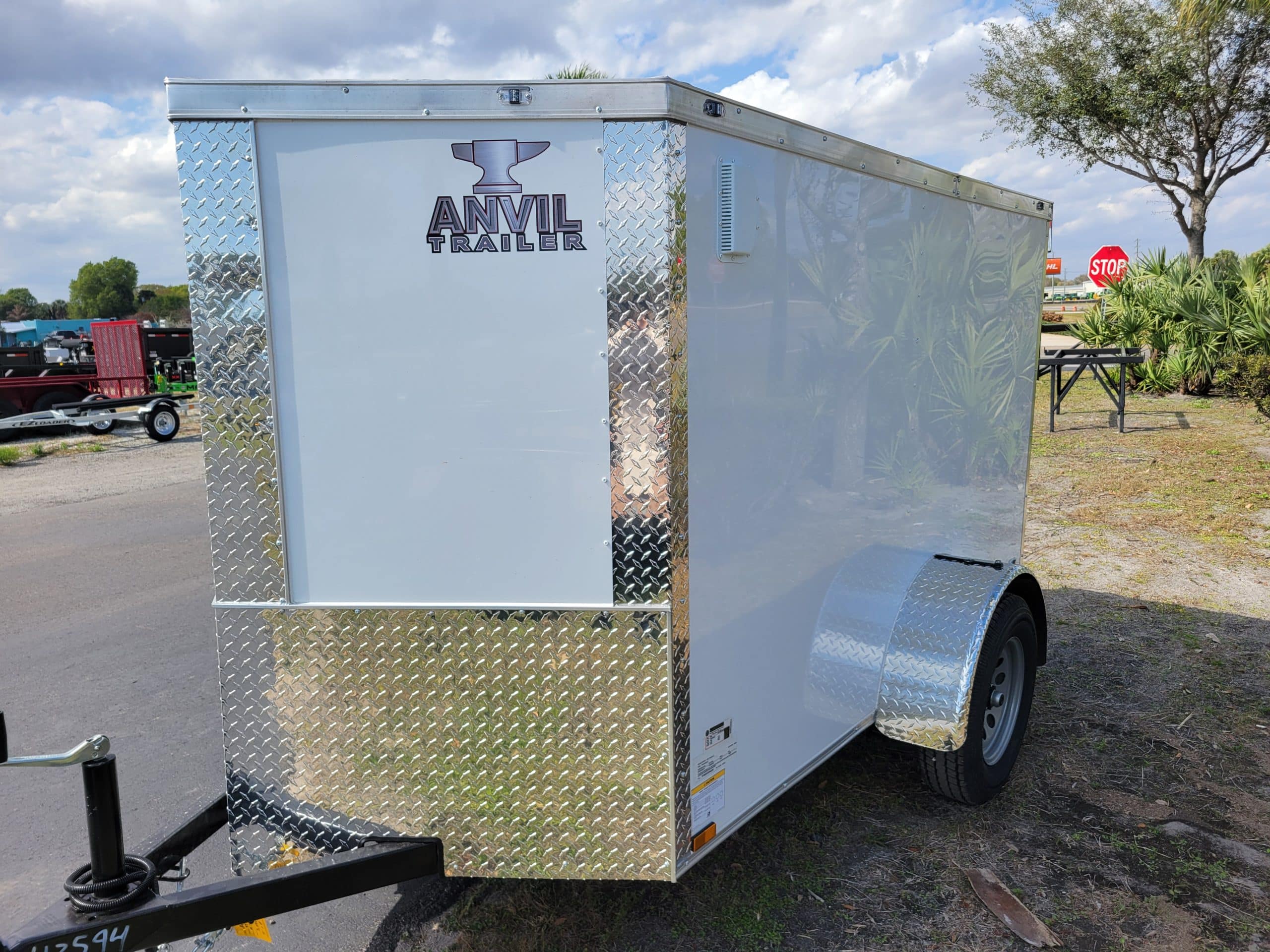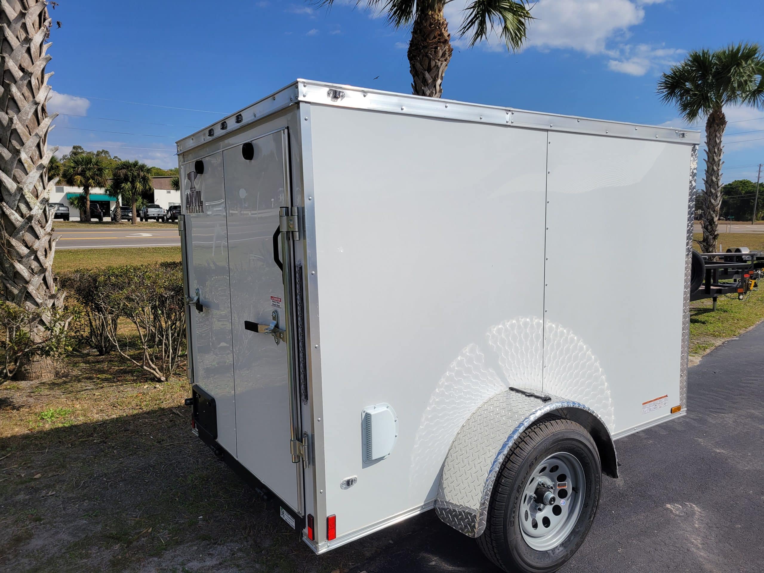 Anvil 2027 5 x 8 Cargo Trailer. V-Nose, Rear Ramp Door w/Flap, 24″ Stone Guard, 60″ Interior Height, 12 Volt Dome Light and Switch. 1-2990lb Spring Axle w/205/75R15 Radial Tires on 15″ Steel Silver Wheels, EZ Lube Hubs. 2000lb Tongue Jack w/Sand Foot, 2″ Ball Coupler. LED lighting Package w/4 Flat wiring. 2-Side Vents. .080 Polycore Exteri0r White, Galvalume Roof.