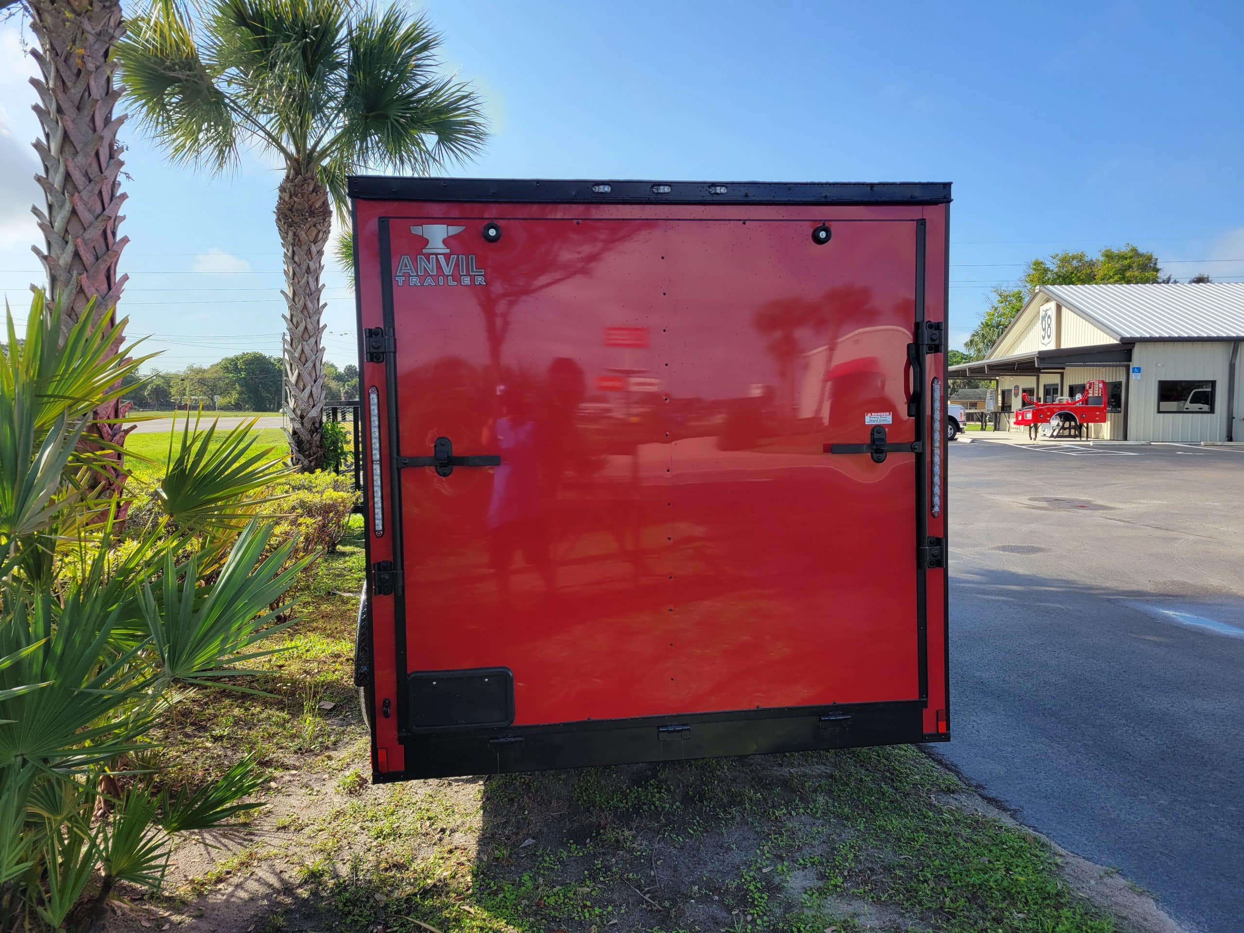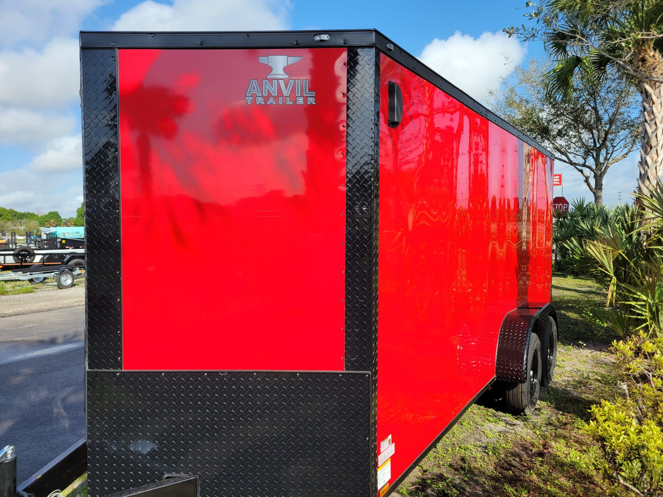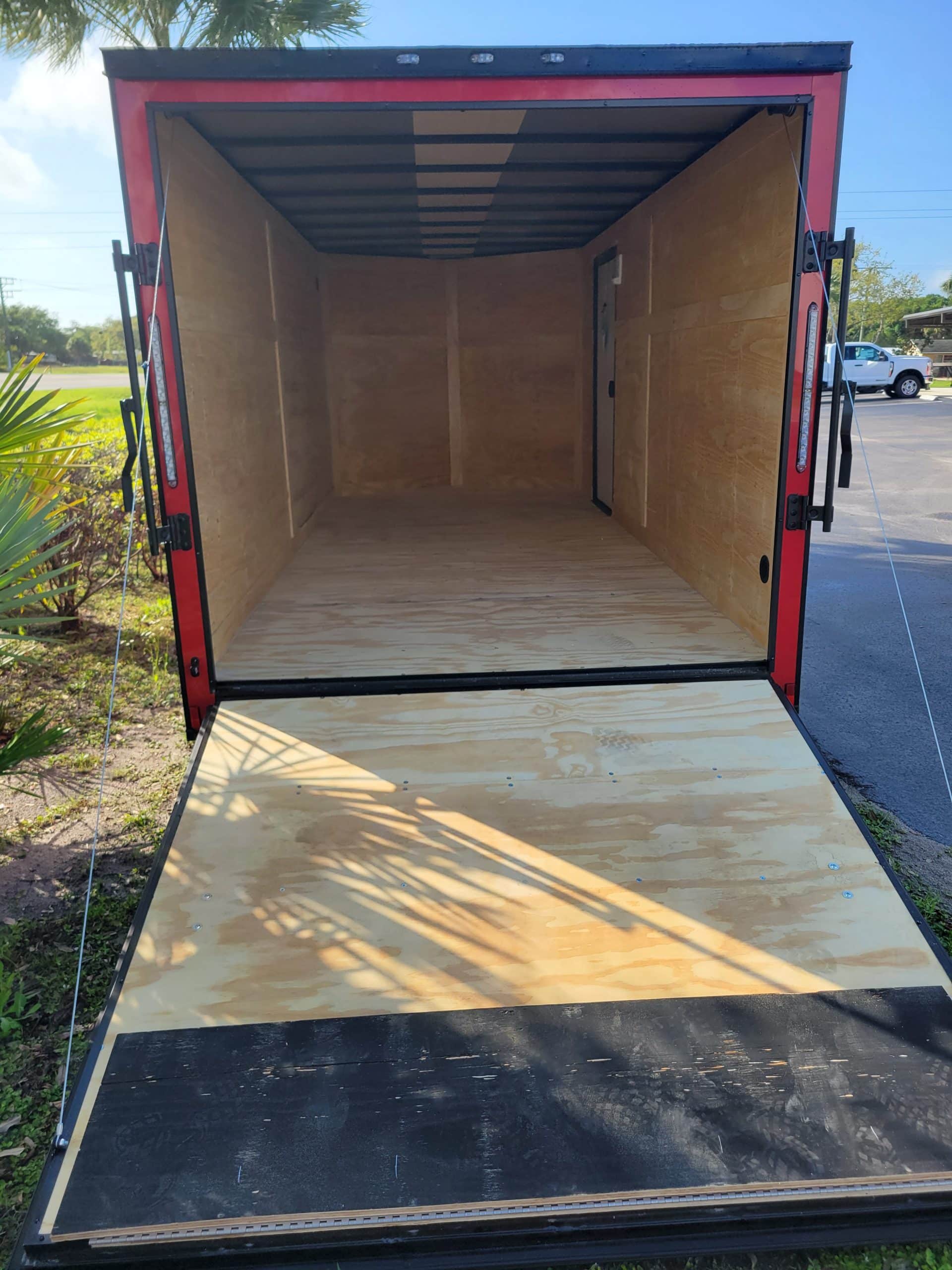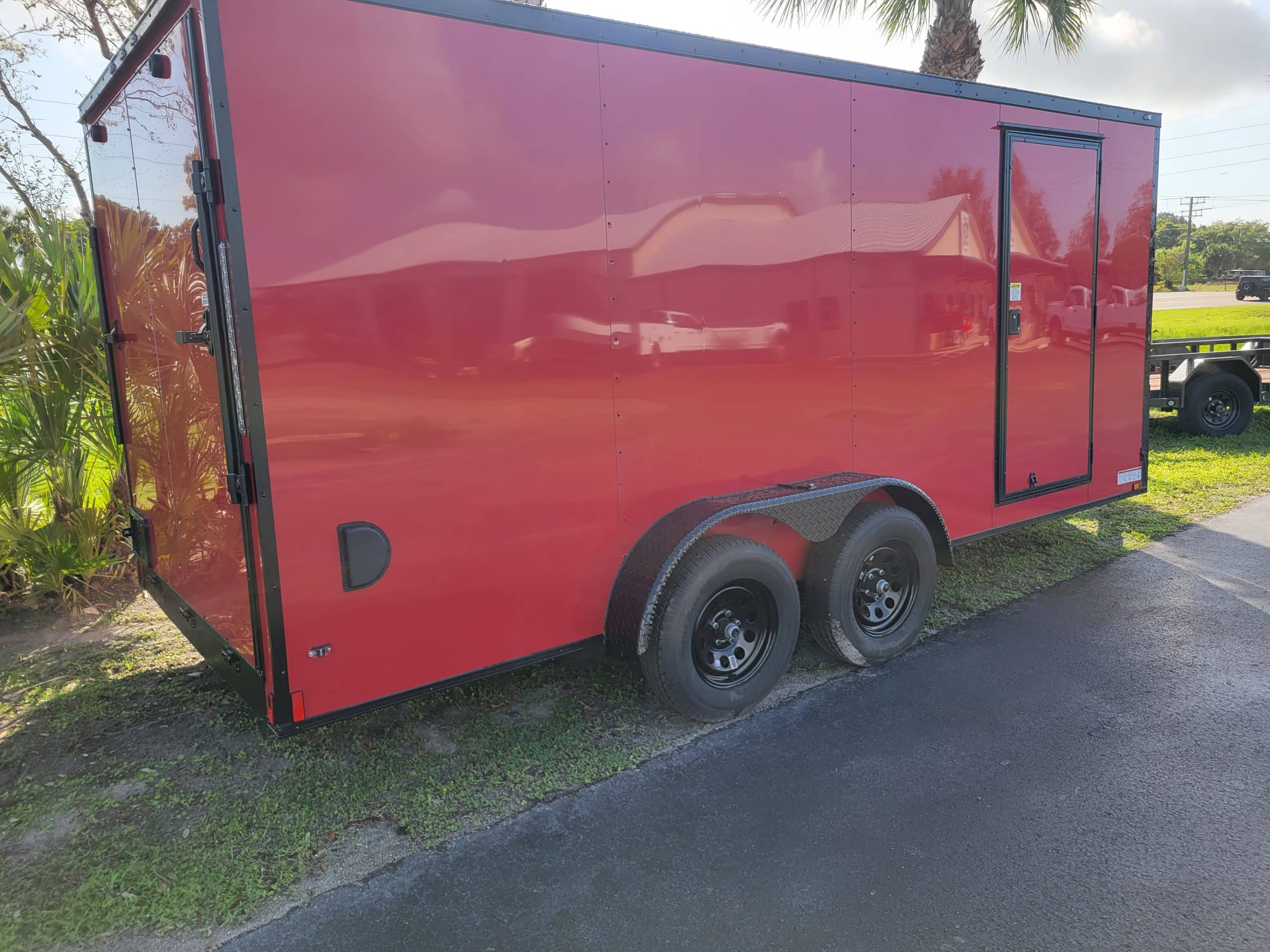 Anvil 7’x16′ Cargo Trailer 2027. V-Nose Front, Rear ramp door, 6’3″ Interior height, 24″ Stone guard, Aluminum fenders, Galvalume one piece roof. 2-3500lb Electric brake spring Axles, ST205/75R15 Radial tires on 15″ Steel Silver Mod wheels w/Spare. 2000lb Top wind jack w/Sand foot, 2-5/16 Ball coupler, 12Volt Dome light, 1-Pair Plastic side vents. 6″ Tubular main frame, 16″ On center Crossmembers, 24″ On center roof bows, 16″ On center wall post. 32″ Side Door w/Flush lock. .080 Red Poly core Exterior w/Blackout Package. LED Lighting package, 7 way RV plug.