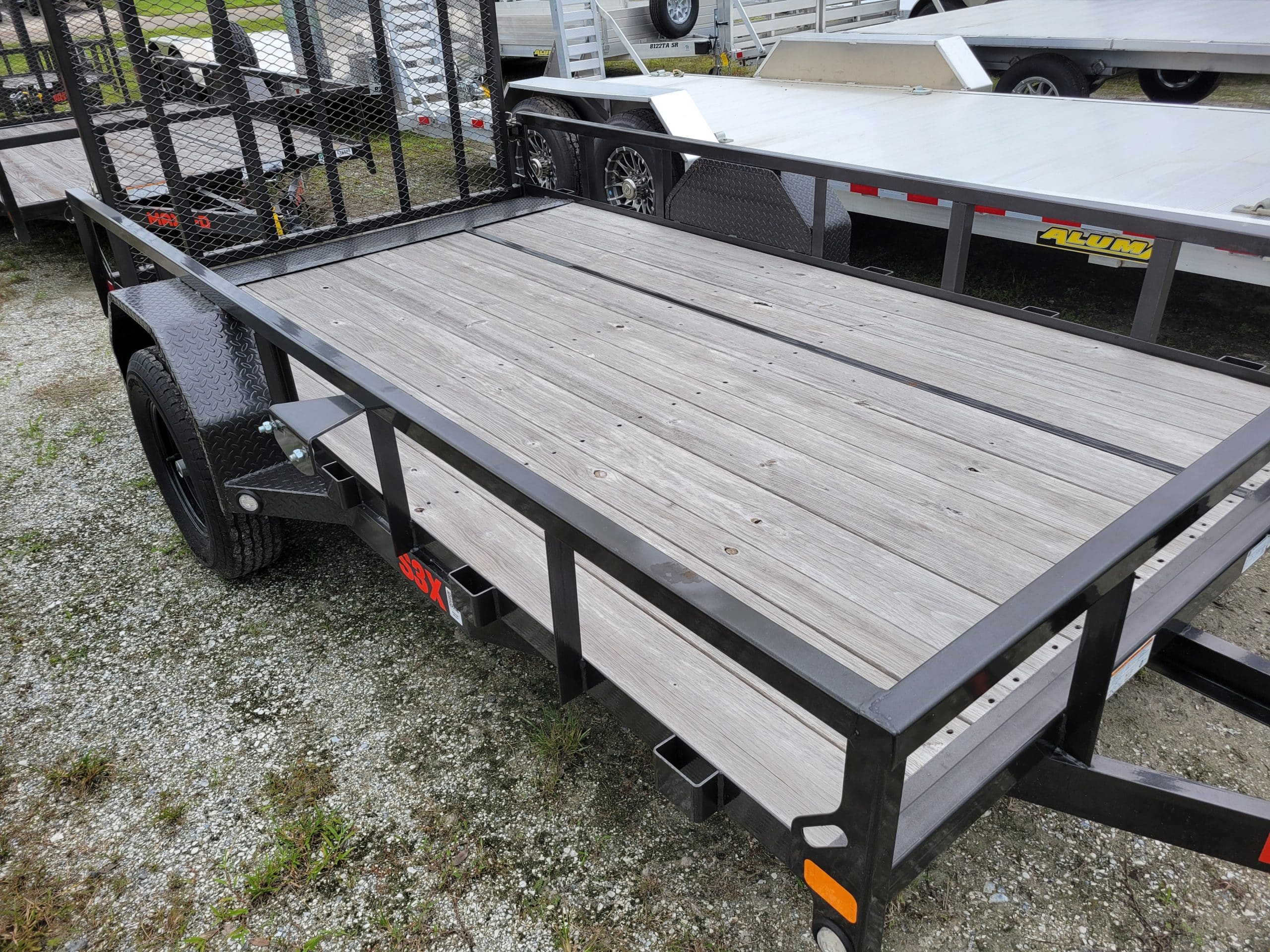 MAXX-D S3X7712, 2024 6.5×12 Single Axle Open Utility Trailer. 2,990 GVWR (Stock# 113819) LOAD CAPACITY: 2,000 lbs GVWR: 2,990 lbs WIDTH: 6.5′ LENGTH: 12′ COUPLER: ADJ. CHANNEL MOUNT 2″ BALL INCLUDED OPTIONS: – 1-3.5K IDLER AXLE, – 4′ SPRING GATE, FOLDABLE ONTO DECK! – 2 3/8 PIPETOP RAILS, – SPARE TIRE/WHEEL, – MAXXD GRAY METALLIC. MAXXD Utility Trailers for Sale in Florida. S3X – The S3X is our standard angle frame single axle utility trailer. It has a 2″ x 3″ x 3/16″ angle main frame with a 4″ channel tongue. It now also comes standard with flush mount LED lights. This trailer comes in a wide variety of dimensions to accommodate your ATVs, UTVs, mowers, and other small equipment. MAXXD Trailers for Sale in Florida. STANDARD FEATURES: – GVWR – 2,990 LB GVWR – COUPLER – 2″ RAM/BULLDOG COUPLER – JACK – 1 – 2K PACIFIC RAM PIPE MOUNT SWIVEL JACK – TONGUE – 4″ CHANNEL WRAP TONGUE – FRAME – 2X3X3/16″ ANGLE FRAME – CROSSMEMBERS – 2X3X3/16″ ANGLE CROSSMEMBERS – SIDES – 2X2X1/8″ ANGLE TOP RAILS AND UPRIGHTS – DOVETAIL – NO DOVETAIL/NO RAMPS – AXLE(S) – 1-3.5K IDLER AXLE DEXTER – SUSPENSION – 4 LEAF EYE TO EYE SPRING SUSPENSION – WHEELS/TIRES – ST205/75D15 C BIAS TIRES ON SILVER WHEELS – FENDERS – 9X32” SMOOTH STEEL SINGLE AXLE FENDERS – FLOOR – 2X8” TREATED WOOD FLOOR – LIGHTS/WIRING – FLUSHMOUNT LED’S/STANDARD WIRING – COLOR – MAXXD GREY or RAVEN BLACK – 61”, 77”, & 83” DECK WIDTHS – 4-WAY MOLDED PLUG WITH STANDARD WIRING – 4 – 4X3X3/16” STAKE POCKETS – SPARE TIRE MOUNT – SAFETY CHAINS – LICENSE PLATE BRACKET – MECHANICALLY CLEANED AND PREPPED – SAND BLASTED, ACID WASHED, AND PRE HEATED – POWDER COATED WITH PRIMER STANDARD ***DISCLAIMER*** Features and sizes may change. Photos may be of similar, not actual, products. Please verify features, specifications, price, and availability at: Ag98 Trailer Sales 455 US-98 N Okeechobee, Florida 34972